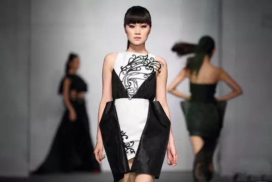 一点式:第一,下颌微微仰起,目光半合确定在模特前方20 m处一点,但注意力不在该点上而用余光看两侧。此时目光模糊,眼球向内含。第二,随着下颌下收,头微微低下,眼睛睁开收回余光努力看清这一点,眼球外放。这种方法是将视线定位,把眼神变化与头位变化结合,意在收回观众的注意力,用目光与观众交流。